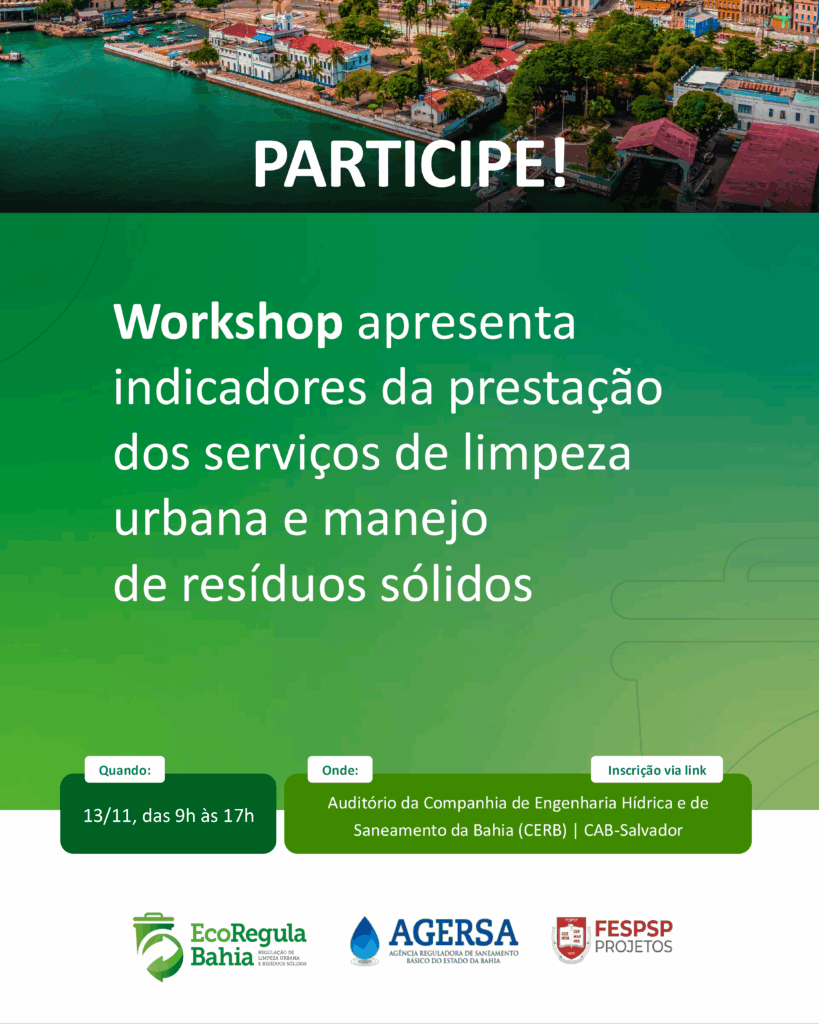 Participe do workshop onde serão apresentados os indicadores técnico-operacionais e econômico-financeiros que serão utilizados pela Agência Reguladora de Saneamento Básico do Estado da Bahia (AGERSA) no acompanhamento da prestação dos serviços de Limpeza Urbana (SLU) e Manejo de Resíduos Sólidos Urbanos (SMRSU).